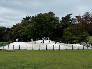 【2年生】生活科校外学習③ 10:41 ぽんぽこ広場に到着した後は、みんなで遊びを楽しみます。 ここでの名物は何と言っても、「ぽんぽこマウンテン」 芝っ子の2年生がみんな揃って遊べるほどの大きな遊具の上を、飛び回ったり走り回ったりして楽しみます。
